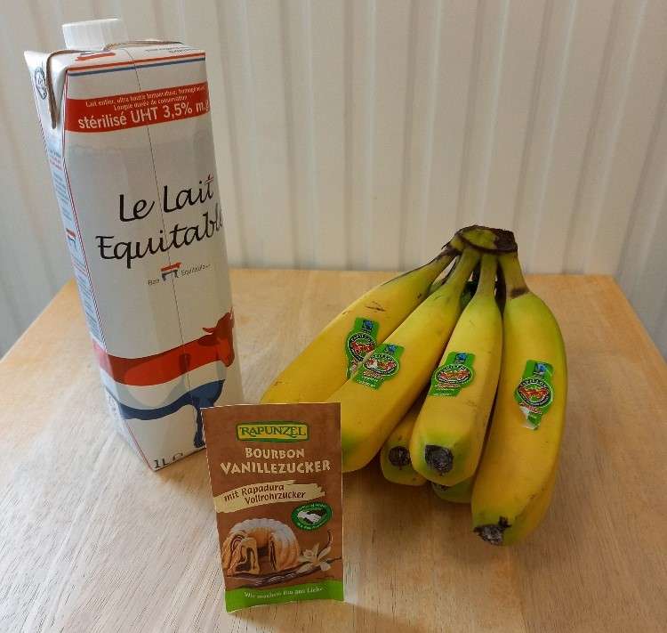 Zuerst die Banane schälen, halbieren und in den Mixer geben. Vanillezucker und Milch hinzufügen.