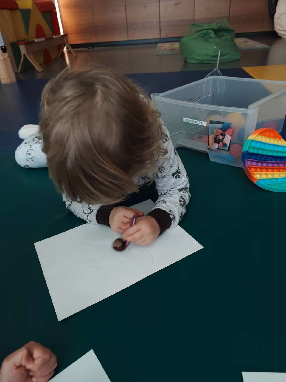 Die Kastanie wird dabei zum Führungswerkzeug für den Buntstift: Das Kind hält und bewegt sie vorsichtig über das Papier, wodurch sanfte Linien, Kurven und Schwünge entstehen – ganz intuitiv und achtsam. Begleitet wird die Aktivität von leiser Entspannungsmusik, die zusätzlich zur beruhigenden Atmosphäre beiträgt.